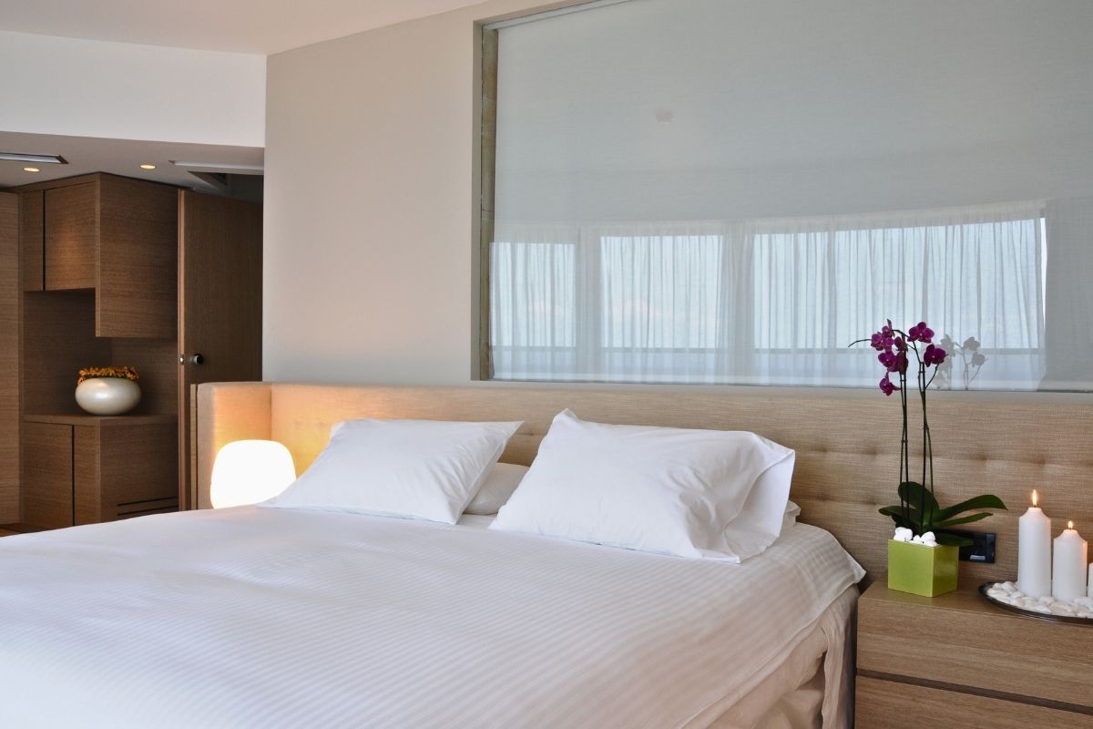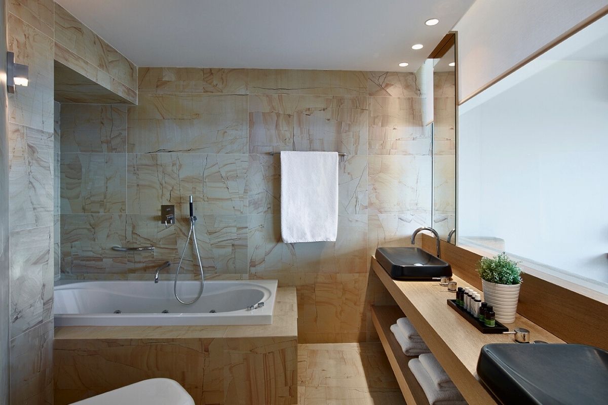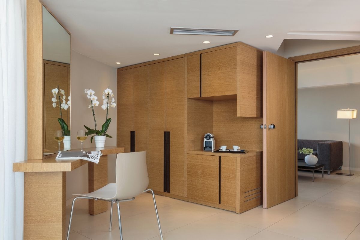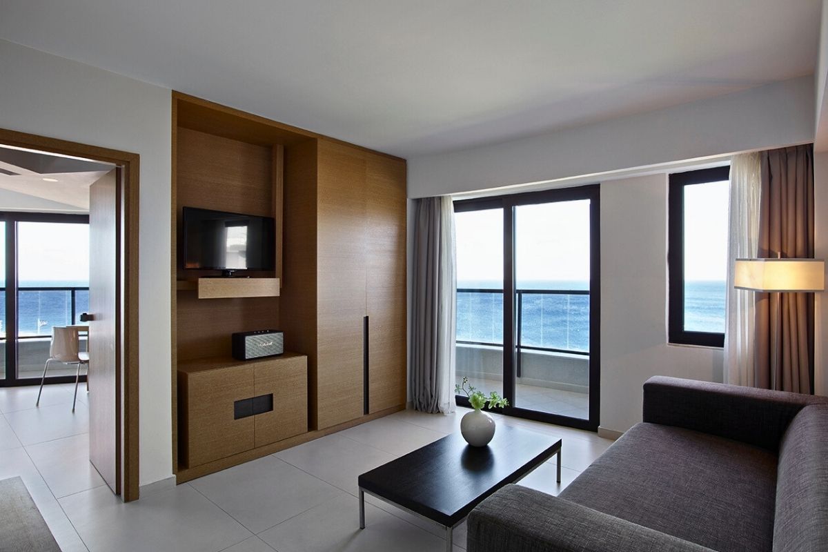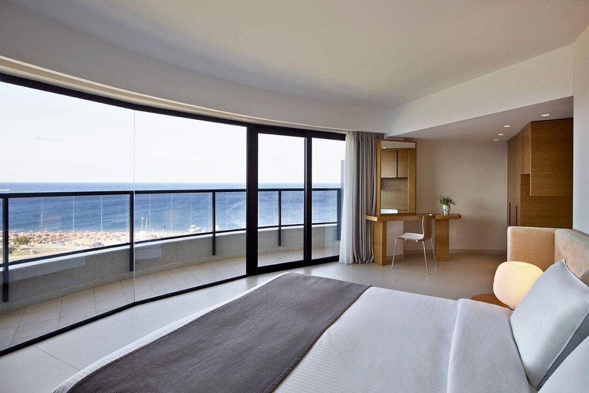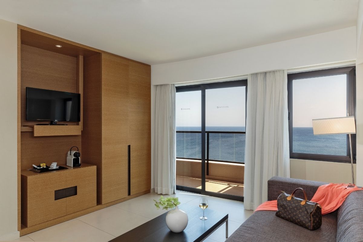 The Panoramic Mediterranean Suites, located on the fifth and sixth floors of the property, combine contemporary design with discreet elements of luxury. Each suite offers unobstructed views of the Mediterranean Sea and the surrounding landscape, including the island’s breath-taking sunsets and full view of the Aquarium of Rhodes & Elli Beach.